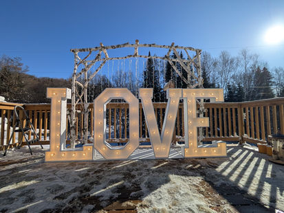 These large freestanding marquee letters are big and bright! Each letter stands 4-feet tall and 2.5-feet wide making LOVE 10-feet wide. Letters can be linked together to reduce the number of electrical outlets required or extension cords required. They are lit with warm white Edison style LED bulbs which are bright enough to use in daylight, and dimmable so they aren't blinding on the dance floor.