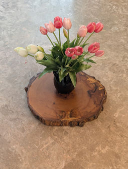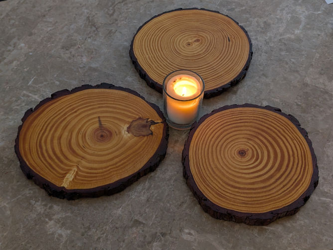 These pine cookies add a rustic touch to your dining tables, include them in your centrepiece or to eleveate other items on the table like condiments or butter. They're approximately 9-10" in diameter with some variation, and have been sanded and sealed to preserve the bark and protect from spills.